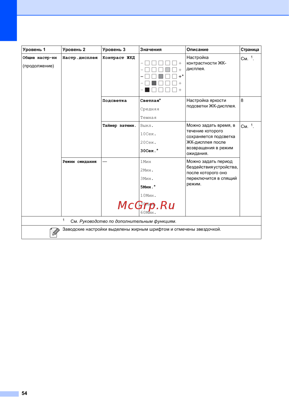 Заводские настройки выделены жирным шрифтом и отмечены звездочкой.