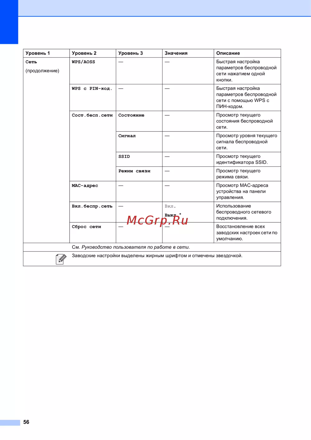 Заводские настройки выделены жирным шрифтом и отмечены звездочкой.