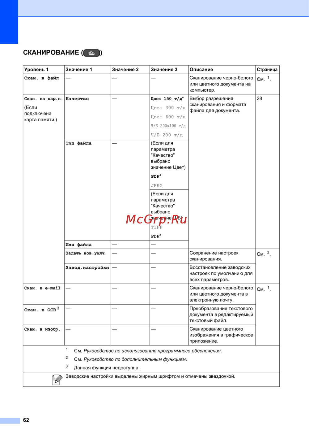 Заводские настройки выделены жирным шрифтом и отмечены звездочкой.
