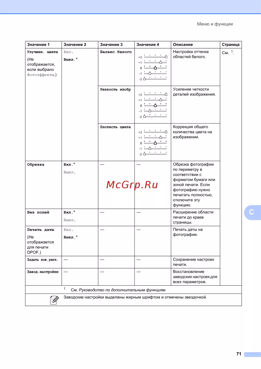Изучите меню и функции настройки печати, включая баланс белого, резкость и обрезку. Узнайте, как оптимизировать качество изображений для печати.