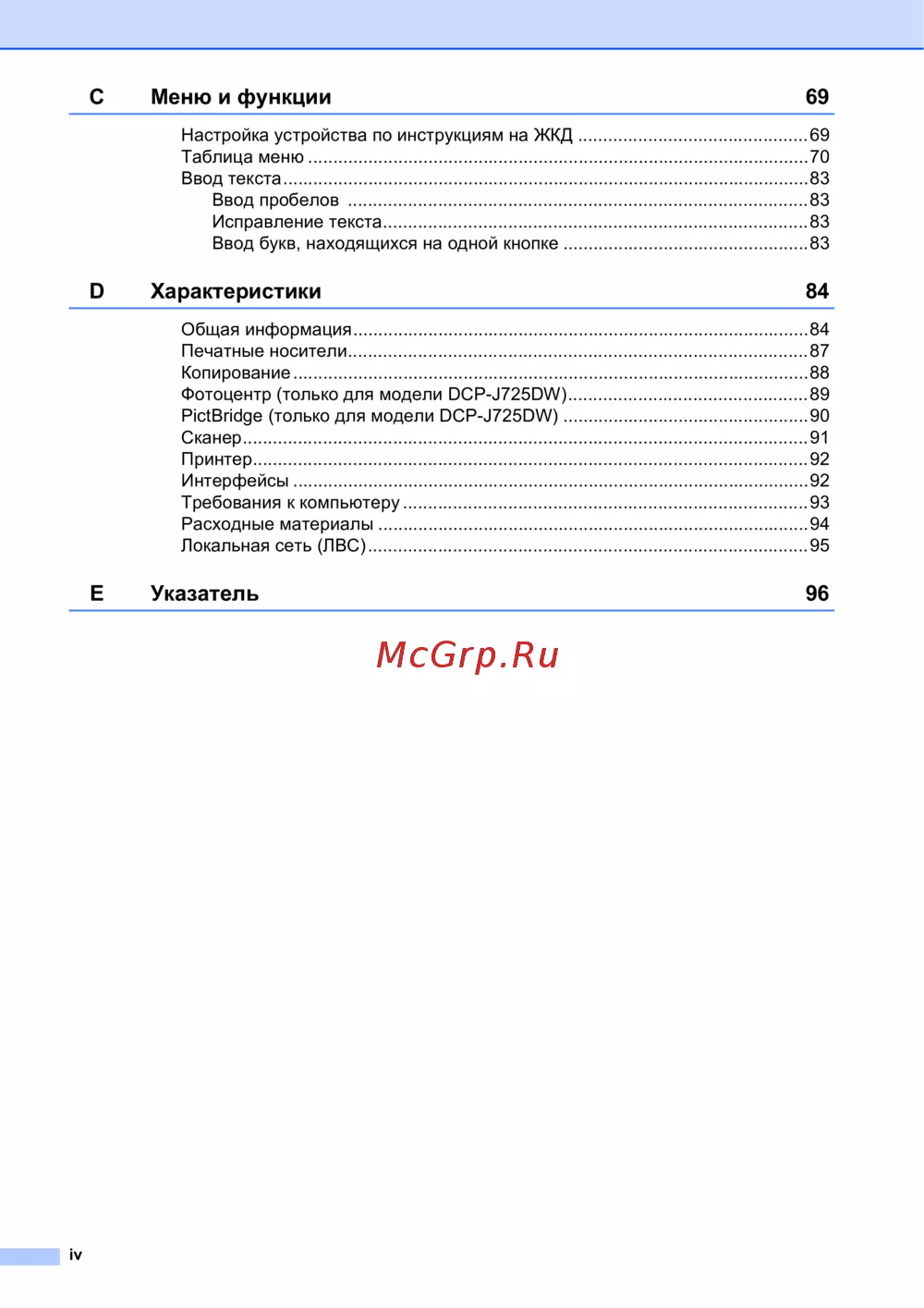 - Параметры для функции индексная страница только для модели dcp j725dw p.90