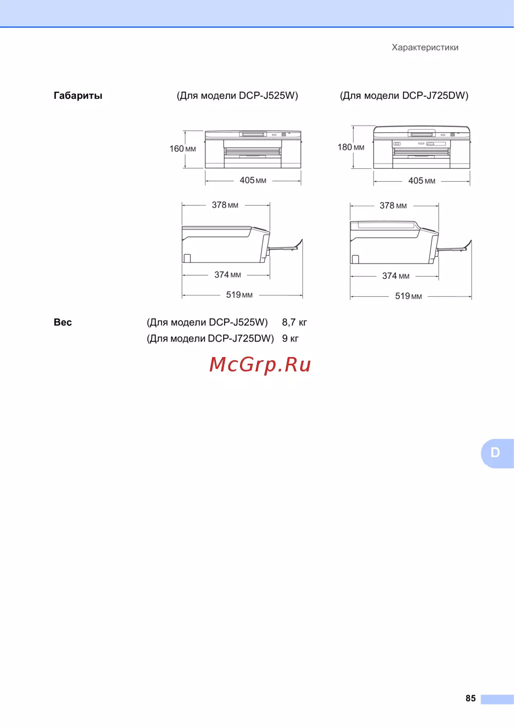 Габариты (Для модели DCP-J525W) (Для модели DCP-J725DW)