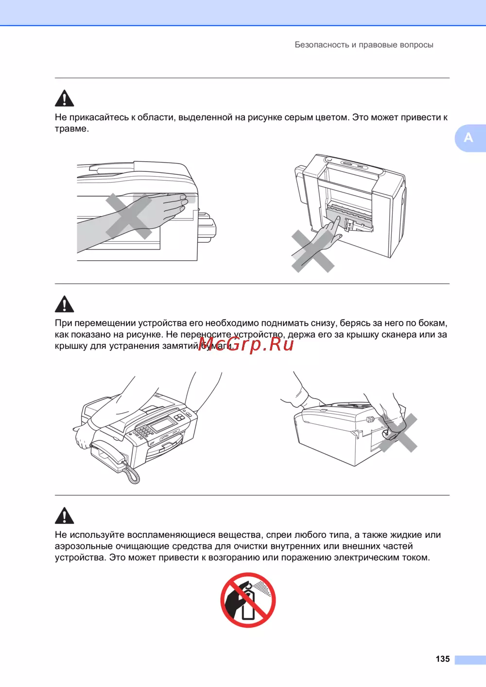 ![Brother MFC-990CW [147/241] При перемещении устройства его необходимо поднимать снизу берясь за него по бокам как показано на рисунке не переносите устройство держа его за крышку сканера или за крышку для устранения замятий бумаги](/views2/1025877/page147/bg93.png)
