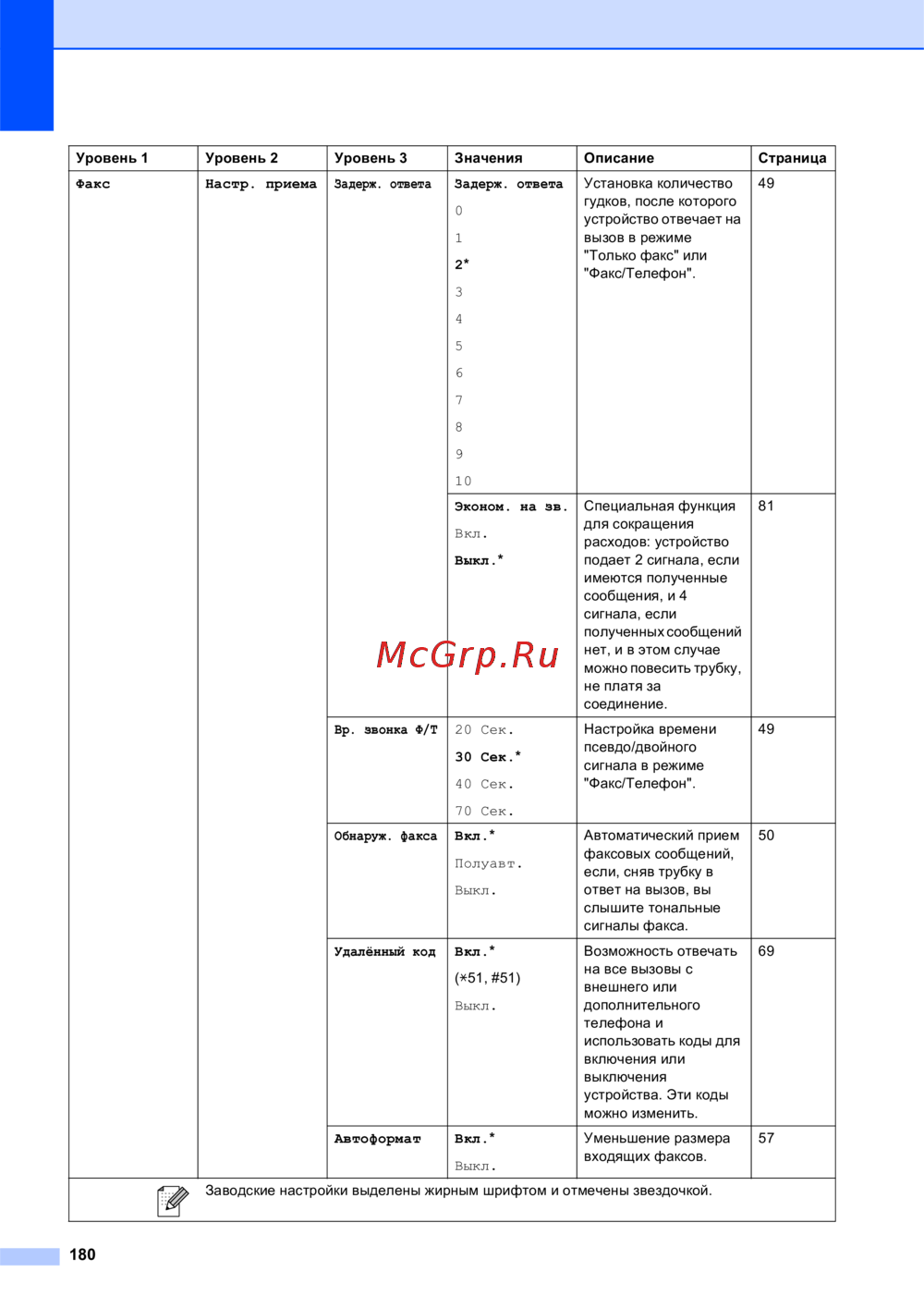 Заводские настройки выделены жирным шрифтом и отмечены звездочкой.