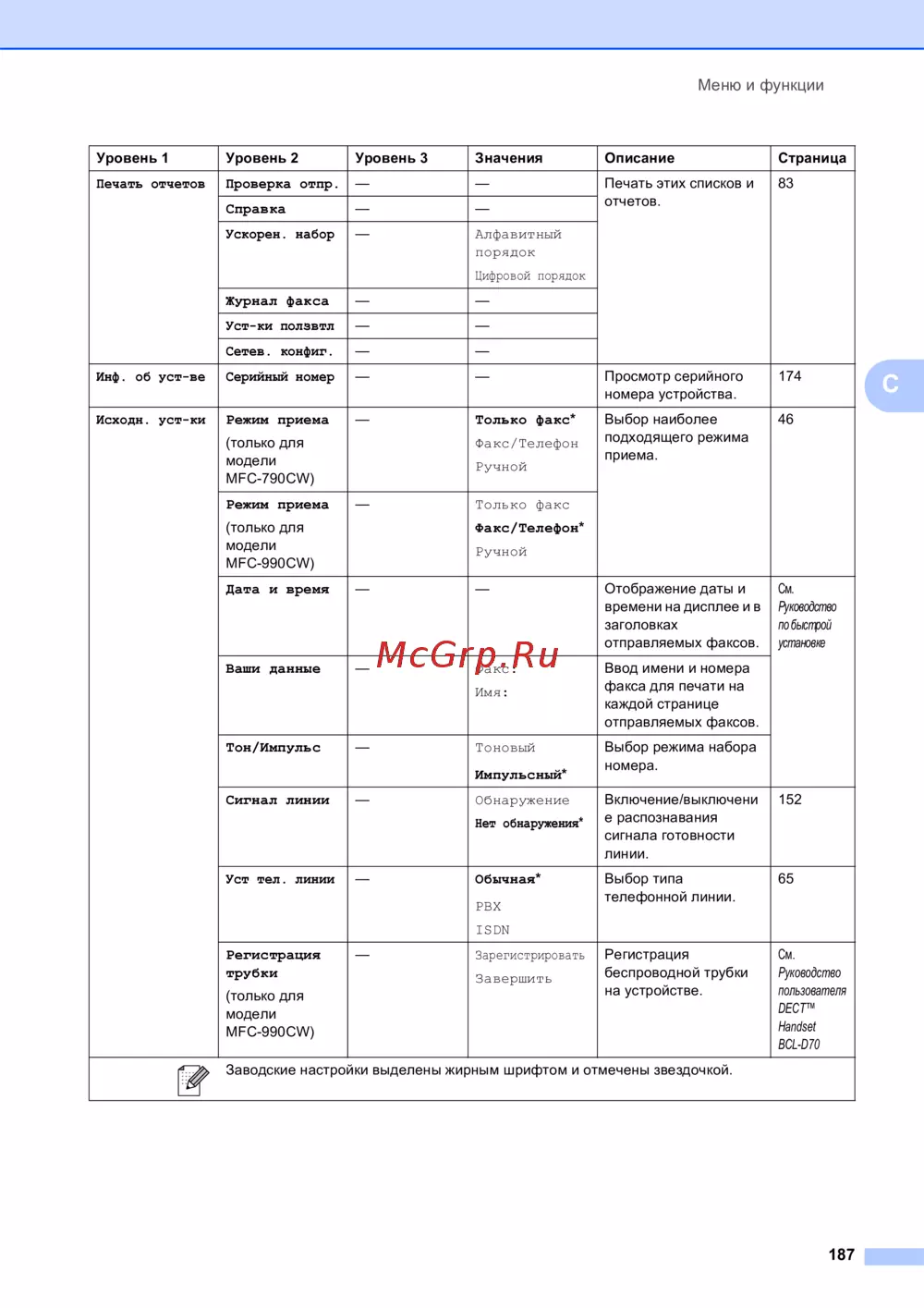 - Таблица поможет разобраться в имеющихся пунктах меню и значениях параметров устройства заводские настройки выделены жирным шрифтом и отмечены звездочкой p.190
