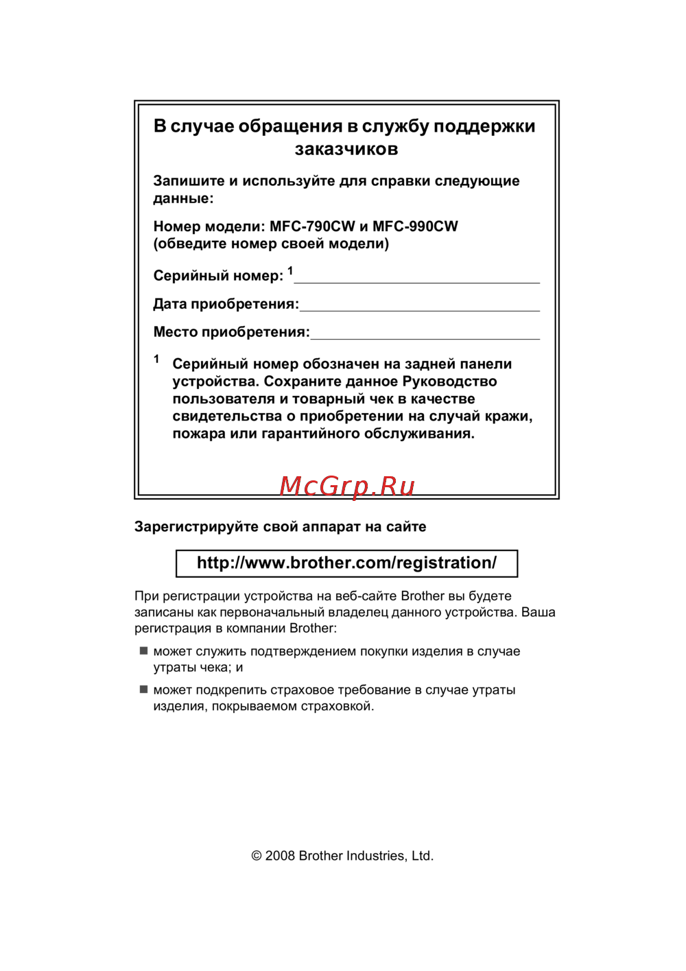 Brother MFC-990CW — информация для обращения в службу поддержки заказчиков [2/241]
