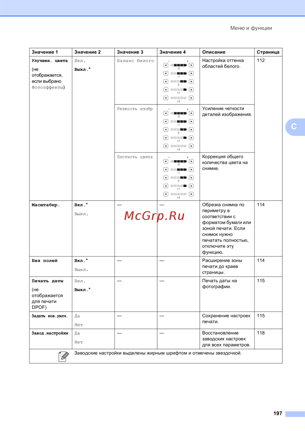 Заводские настройки выделены жирным шрифтом и отмечены звездочкой.