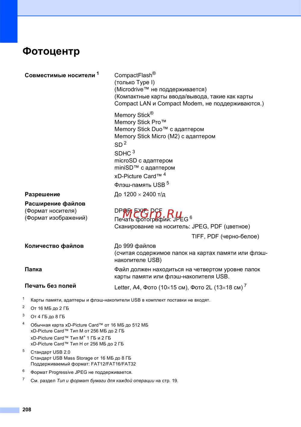 Brother MFC-990CW — обзор совместимых карт памяти и флэш-накопителей для печати [220/241]