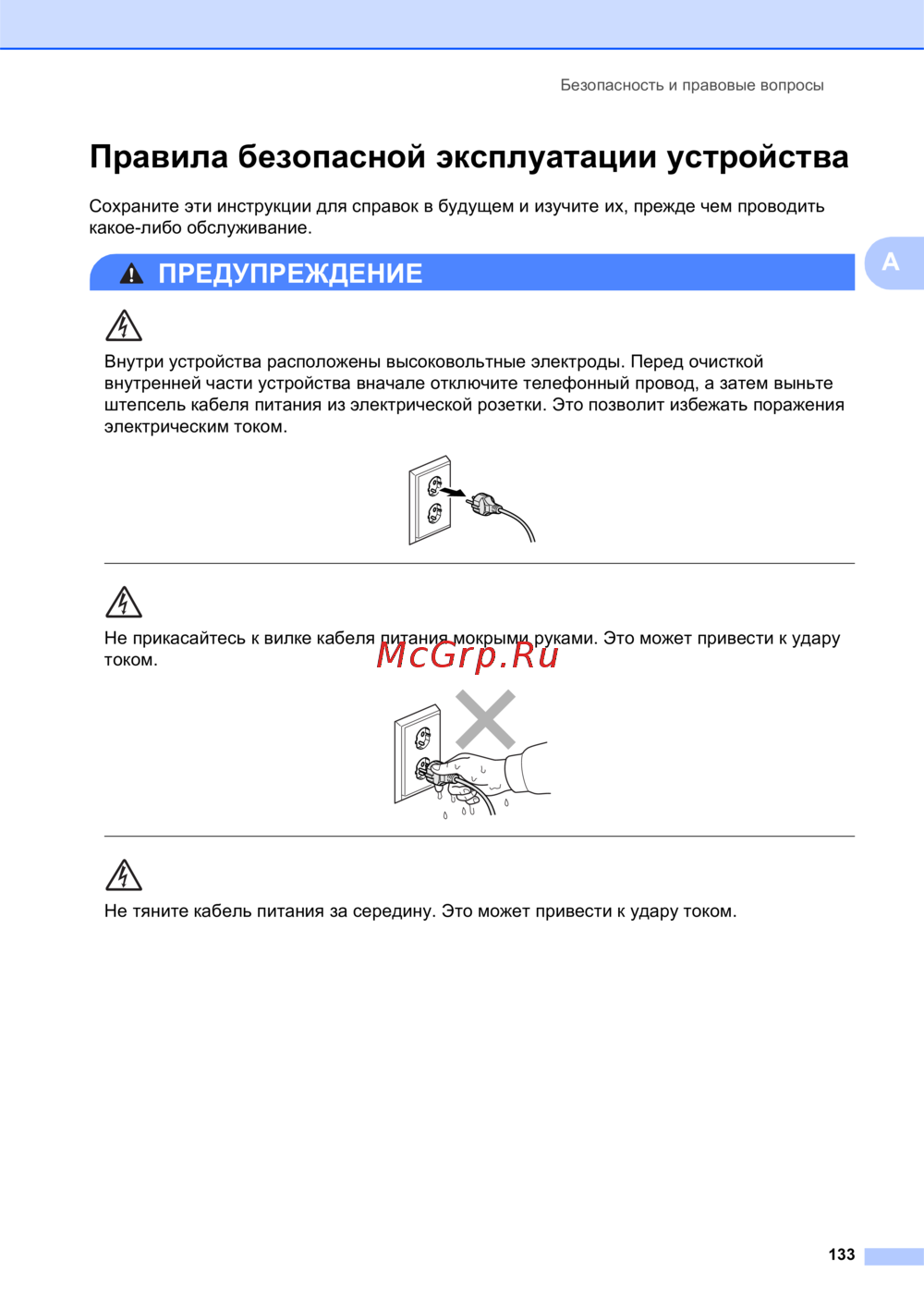 Brother MFC-790CW — правила безопасной эксплуатации электрических устройств [145/241]