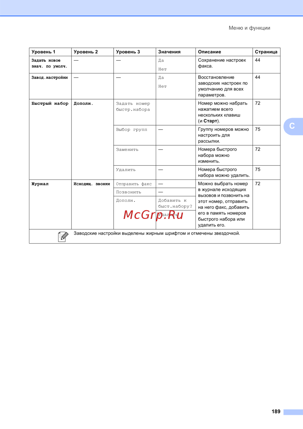 - Таблица поможет разобраться в имеющихся пунктах меню и значениях параметров устройства заводские настройки выделены жирным шрифтом и отмечены звездочкой p.190
