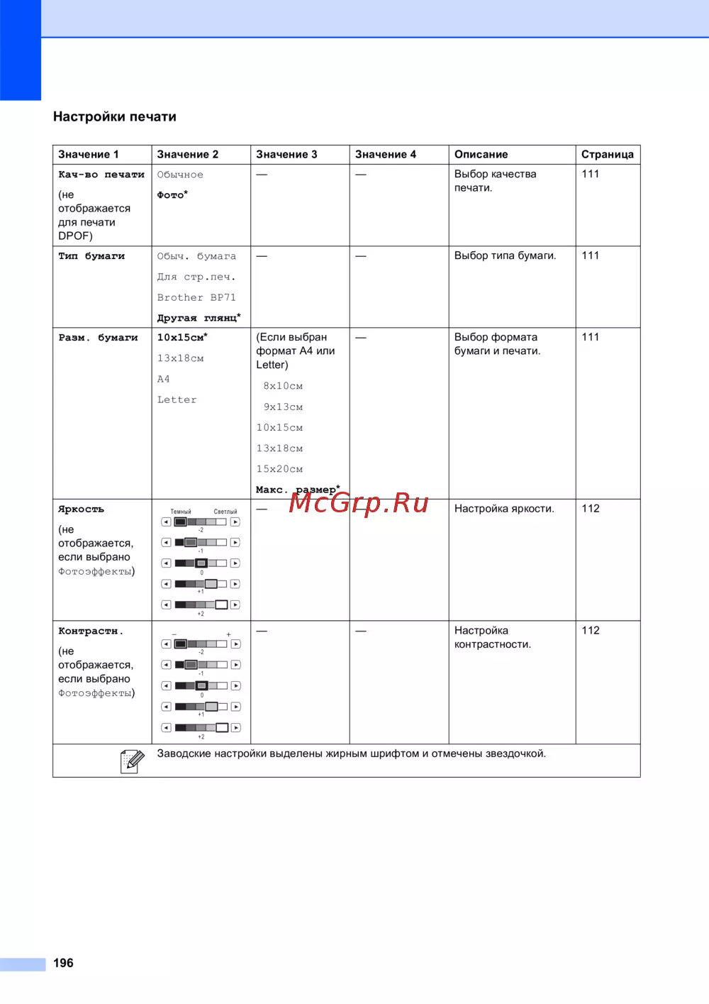Заводские настройки выделены жирным шрифтом и отмечены звездочкой.