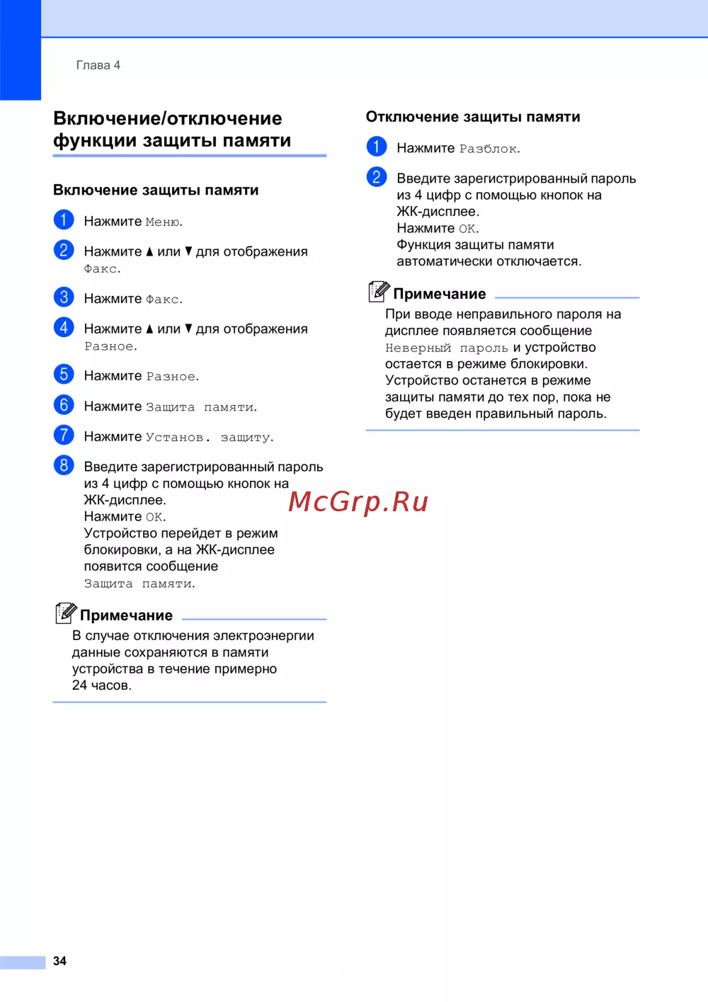 Brother MFC-790CW — инструкция по включению и отключению защиты памяти устройства [46/241]
