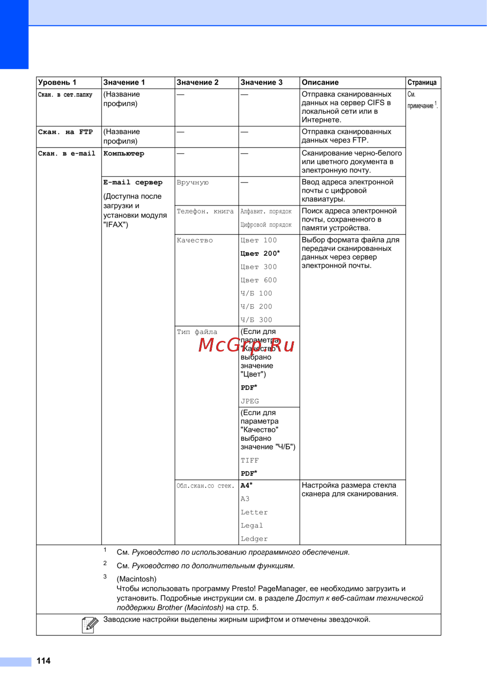 Заводские настройки выделены жирным шрифтом и отмечены звездочкой.