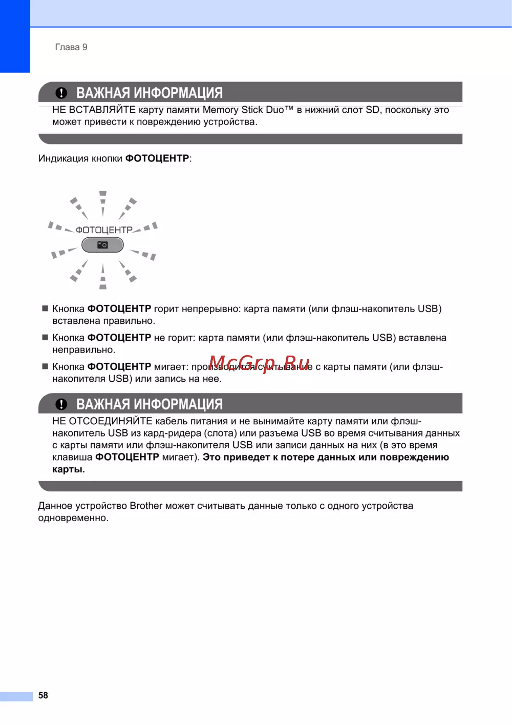 клавиша ФОТОЦЕНТР мигает). Это приведет к потере данных или повреждению