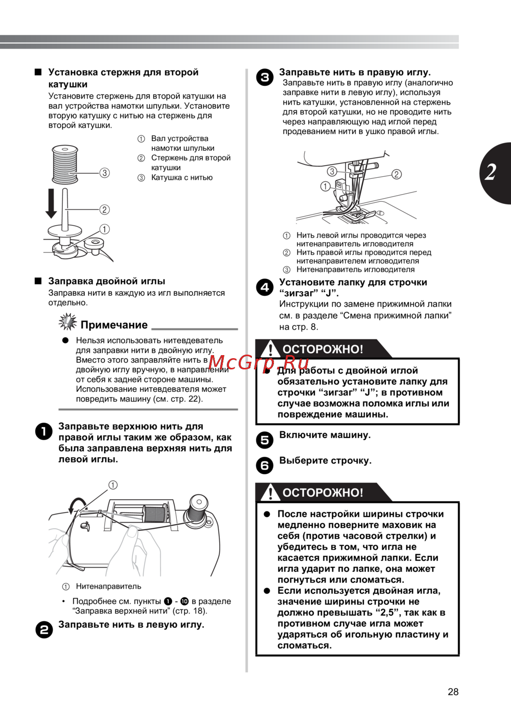 - Убедитесь что шпульный колпачок вставлен правильно так как в противном случае игла может сломаться p.45