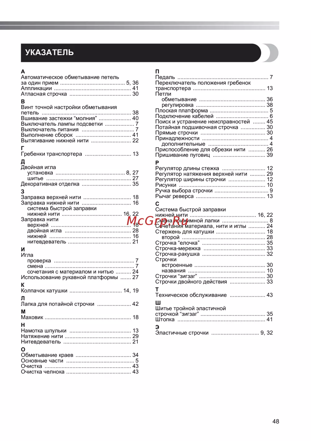 - П педаль 7 переключатель положения гребенок транспортера 13 петли обметывание 36 регулировка 38 плоская платформа 5 подключение кабелей 6 поиск и устранение неисправностей 45 потайная подшивочная строчка 30 прямые строчки 30 принадлежности 4 дополнительные 4 приспособление для обрезки нити 26 пришивание пуговиц 39 р регулятор длины стежка 12 регулятор натяжения верхней нити 29 регулятор ширины строчки 12 рисунки 10 ручка выбора строчки 9 рычаг реверса 13 с система быстрой заправки нижней нити 16 22 смена прижимной лапки 8 сочетания материала нити и иглы 24 стержень для катушки 18 второй 28 строчка елочка 35 строчка мережка 33 строчка ракушка 32 строчки встроенные 30 названия 10 строчки зигзаг 30 строчки двойного действия 33 т техническое обслуживание 43 ш шитье тройной эластичной строчкой зигзаг 35 штопка 41 э эластичные строчки 9 32 p.49