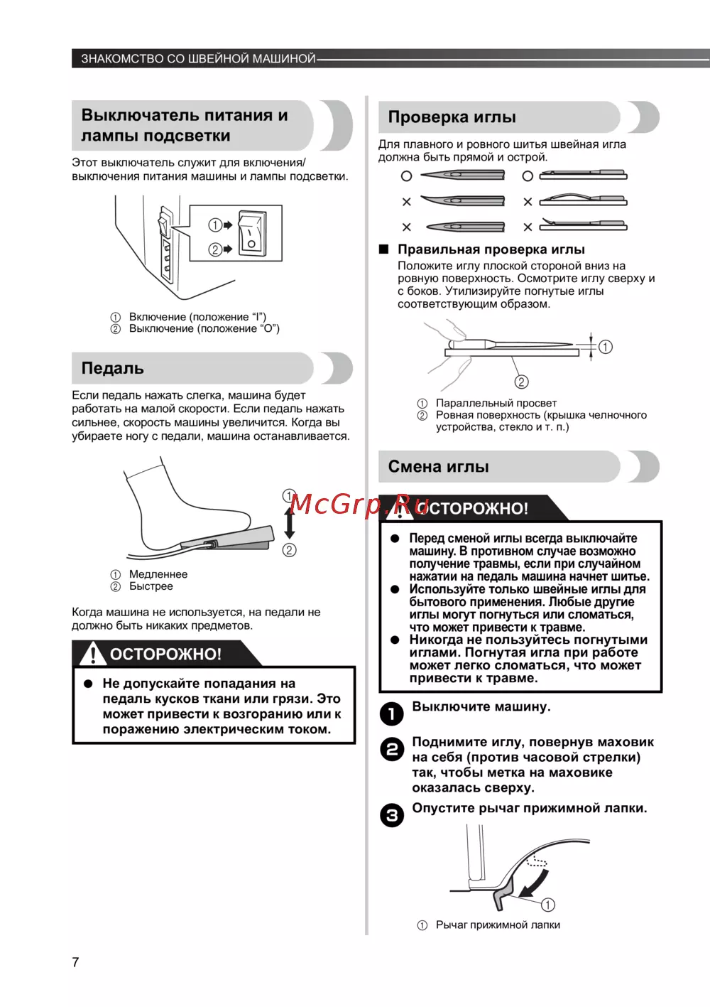 Узнайте, как правильно использовать швейную машину, включая включение, управление скоростью и проверку иглы. Обеспечьте безопасность при шитье.