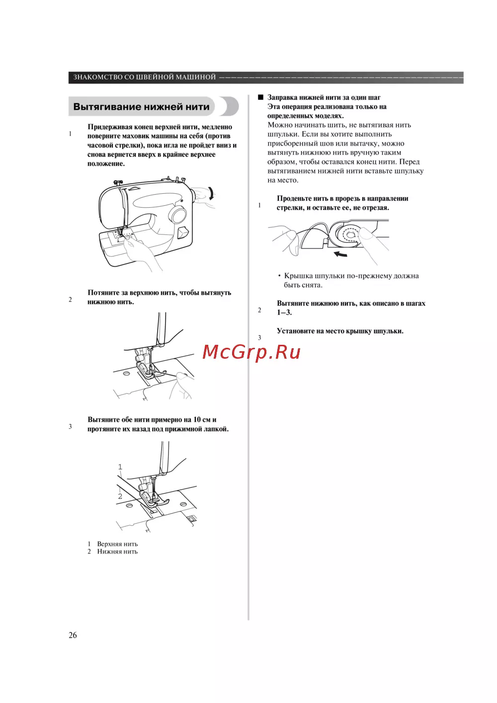 - Поворачивайте маховик машины только на себя против часовой стрелки поворот маховика в другом направлении может привести к повреждению машины p.56
