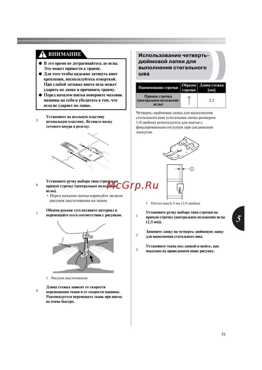 - Перед началом шитья поверните маховик машины на себя и убедитесь в том что игла не ударяет по лапке p.51