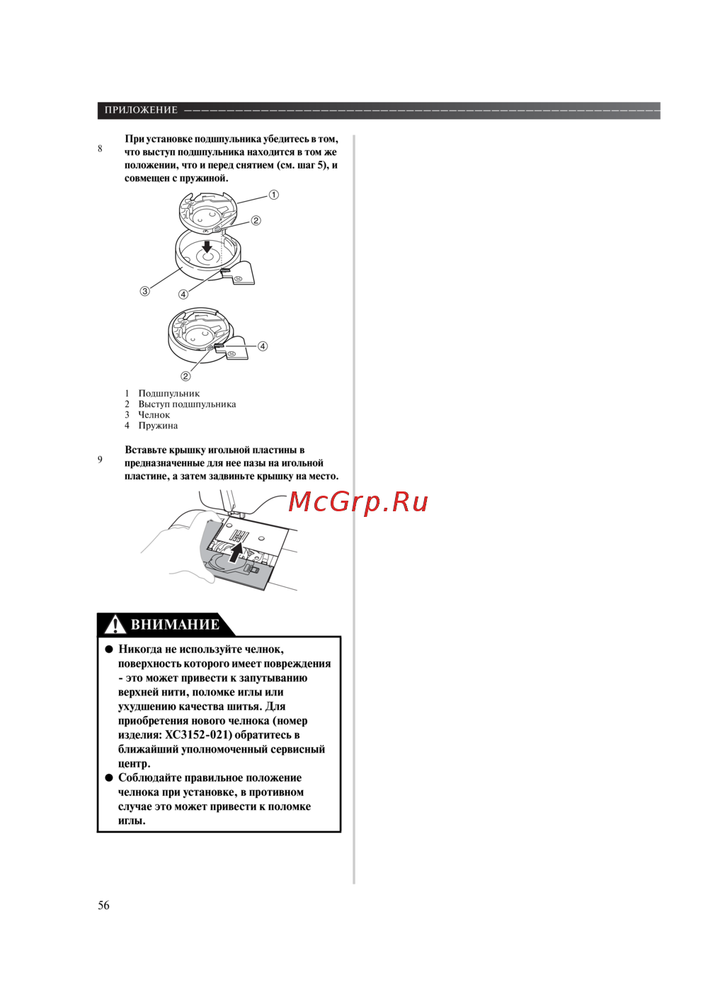 - Перед началом шитья поверните маховик машины на себя и убедитесь в том что игла не ударяет по лапке p.51