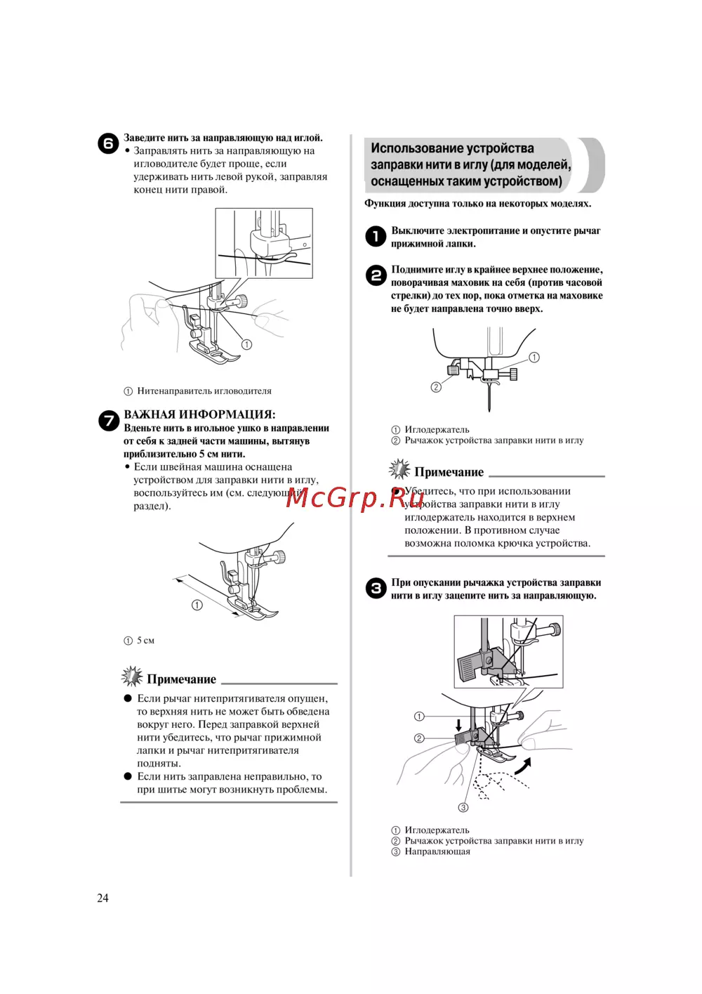 - Следите за тем чтобы при шитье игла не ударила по наметочной булавке или по каким либо иным предметам это может вызвать запутывание нити или поломку иглы что может привести к травме p.32
