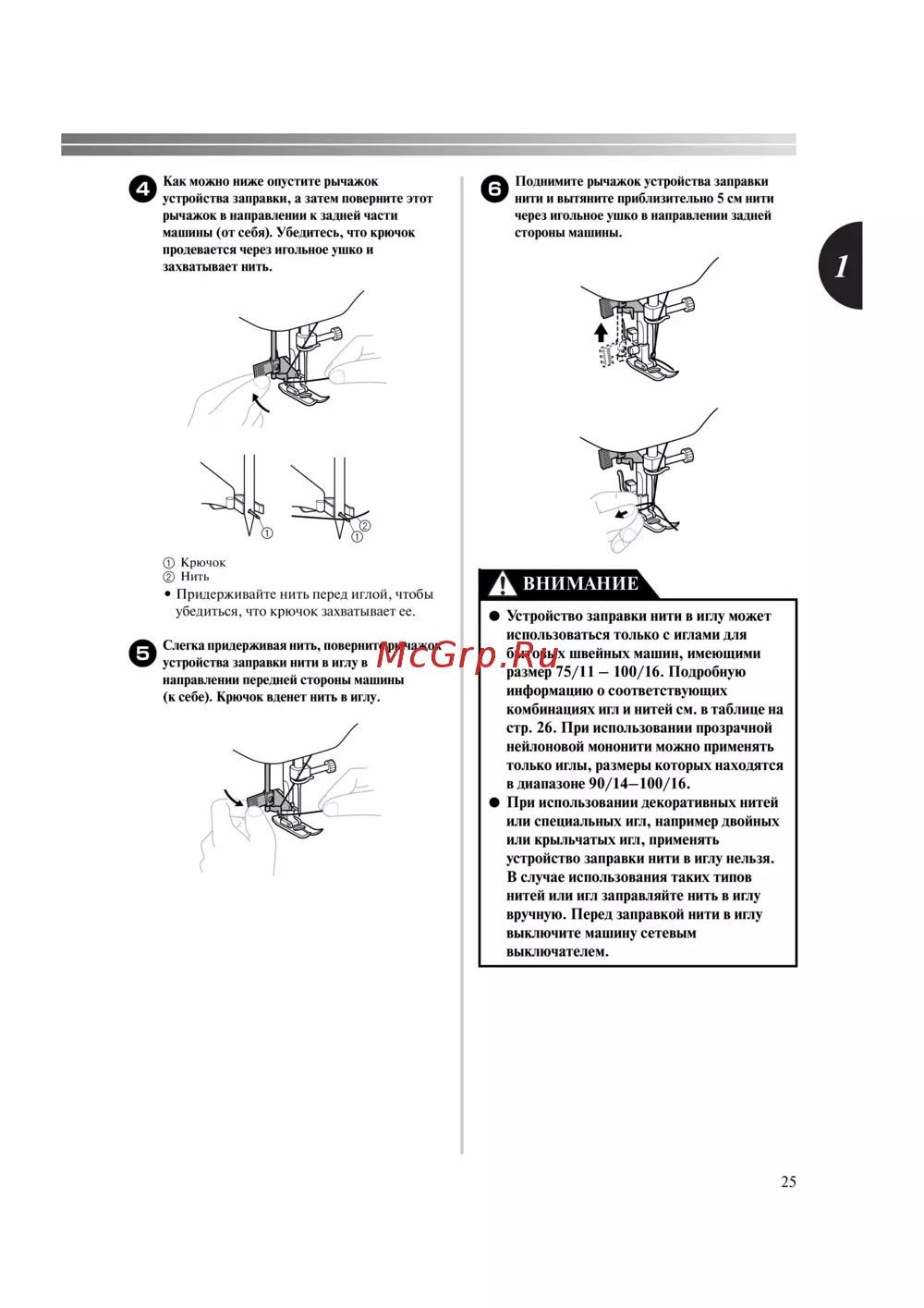 нитей или игл заправляйте нить в иглу