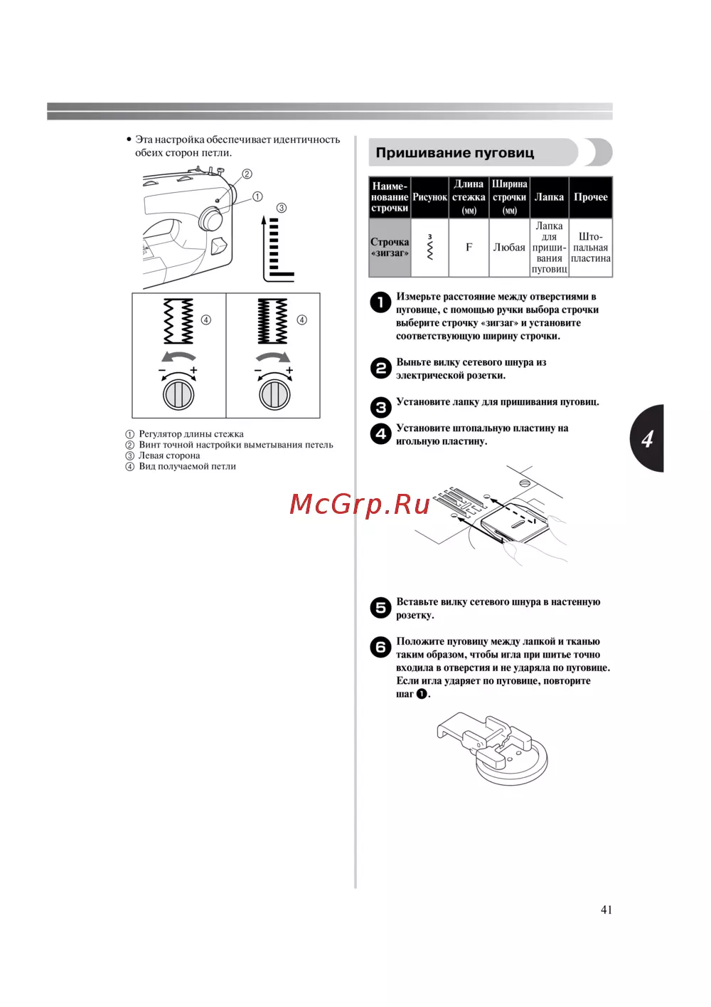 - Следите за тем чтобы при шитье игла не ударяла по пуговице это может привести к поломке иглы и травме p.43