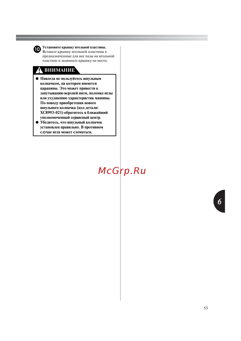- Следите за тем чтобы при шитье игла не ударила по наметочной булавке или по каким либо иным предметам это может вызвать запутывание нити или поломку иглы что может привести к травме p.32