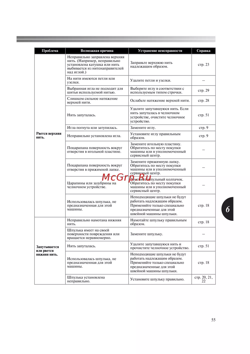 Игла погнута или затупилась. Замените иглу. стр. 9
