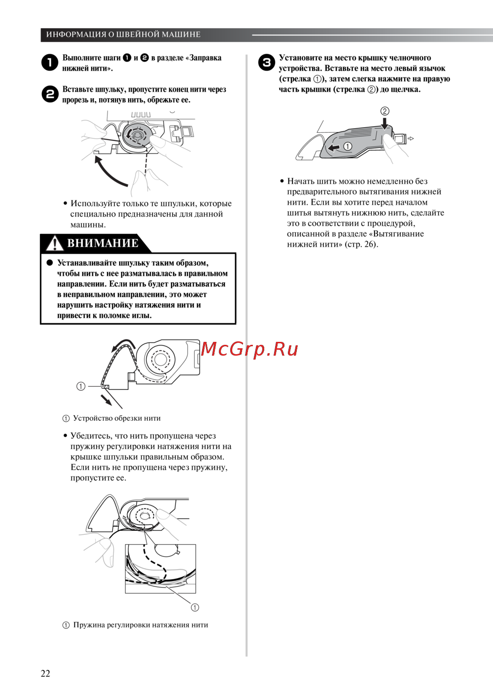 - При вращении маховика рукой поворачивайте его только в направлении к себе против часовой стрелки вращение маховика в другую сторону может привести к запутыванию нити и повреждению иглы и ткани а также к травмам p.32