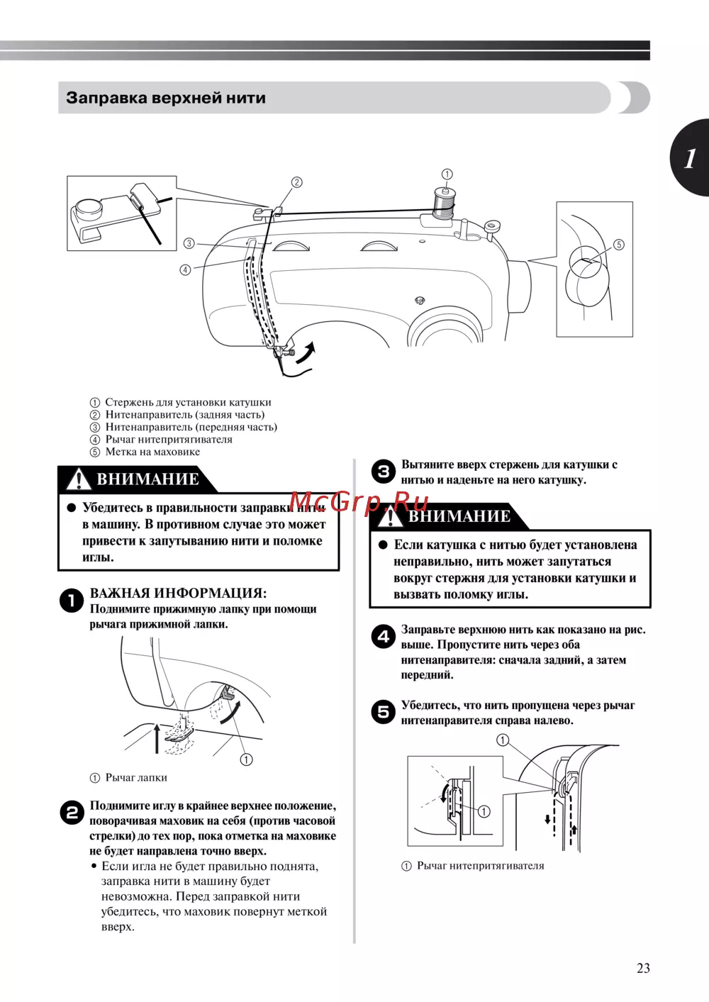 - При вращении маховика рукой поворачивайте его только в направлении к себе против часовой стрелки вращение маховика в другую сторону может привести к запутыванию нити и повреждению иглы и ткани а также к травмам p.32