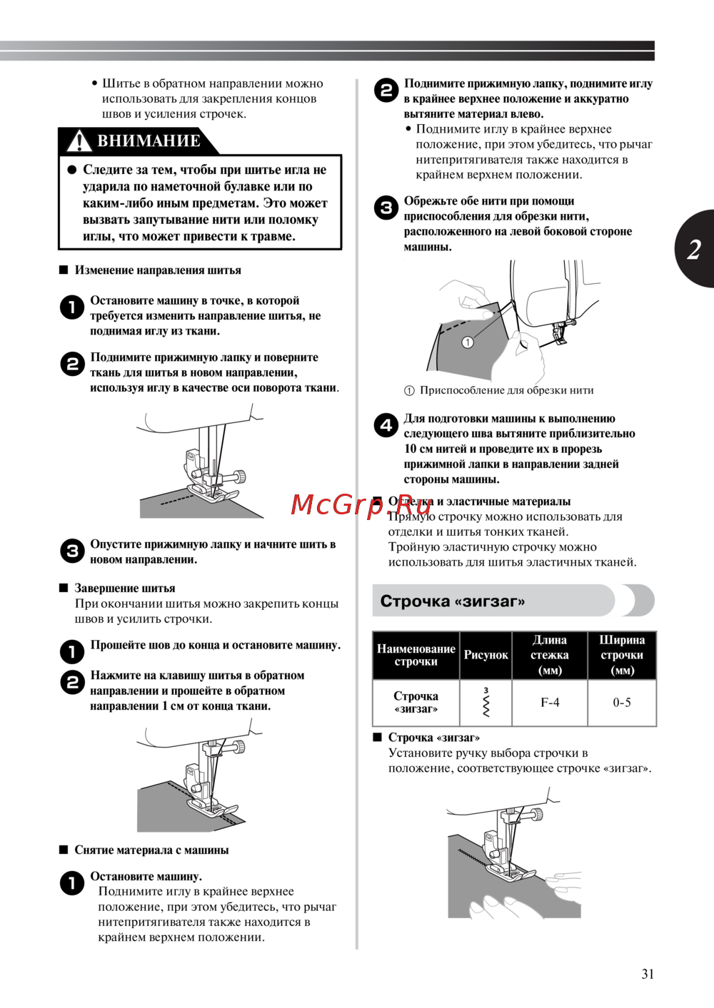 - Не растягивайте и не тяните ткань во время шитья в противном случае это может привести к повреждению иглы и к травме p.32