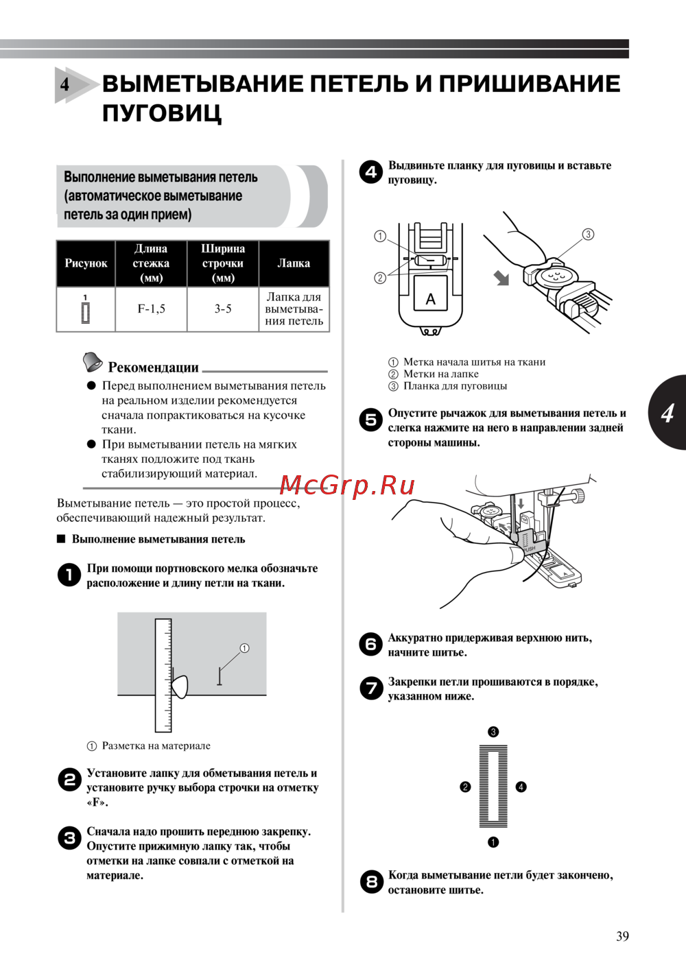 - Следите за тем чтобы при шитье игла не ударяла по пуговице это может привести к поломке иглы и травме p.44