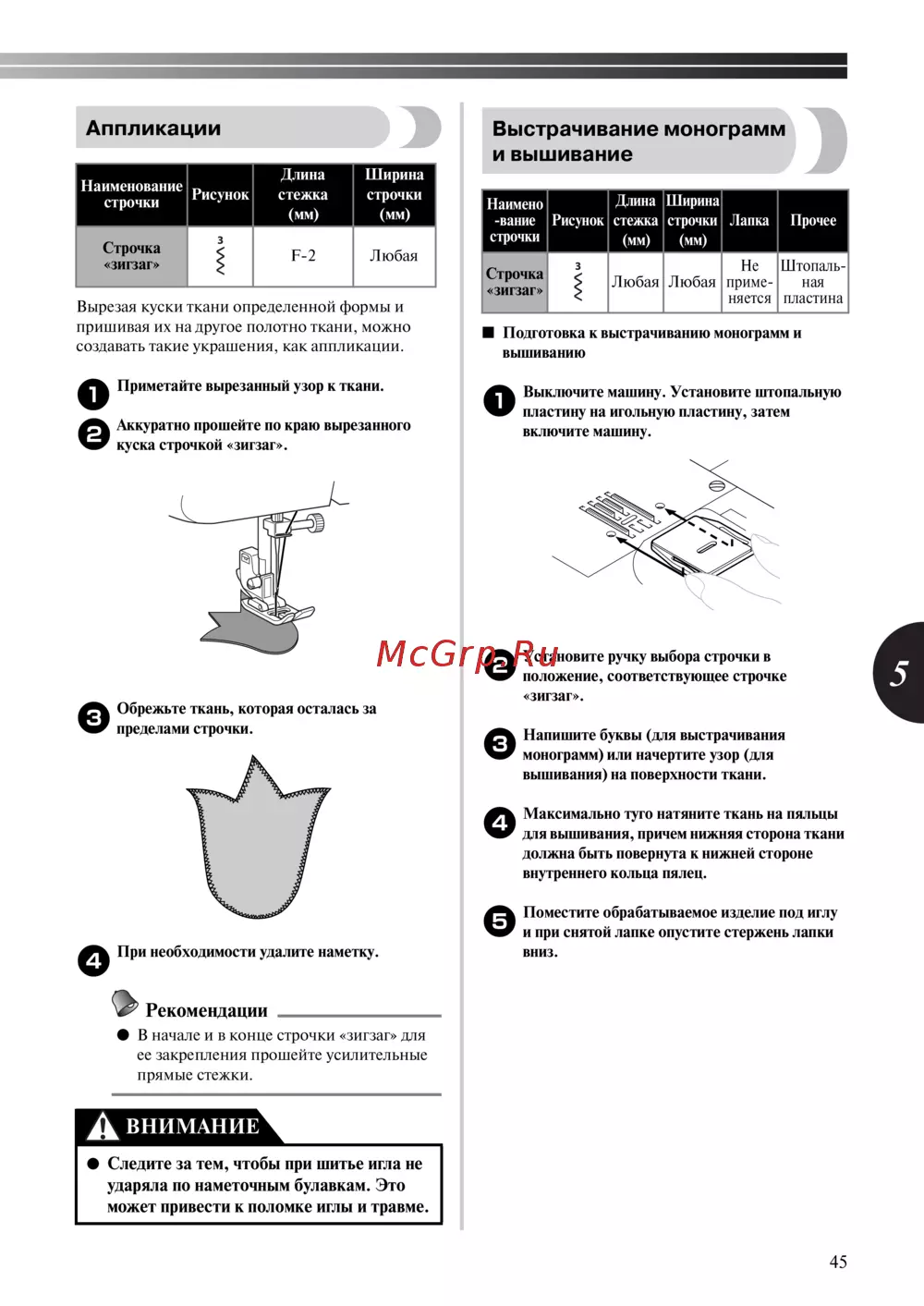 - Следите за тем чтобы при шитье игла не ударяла по пуговице это может привести к поломке иглы и травме p.44