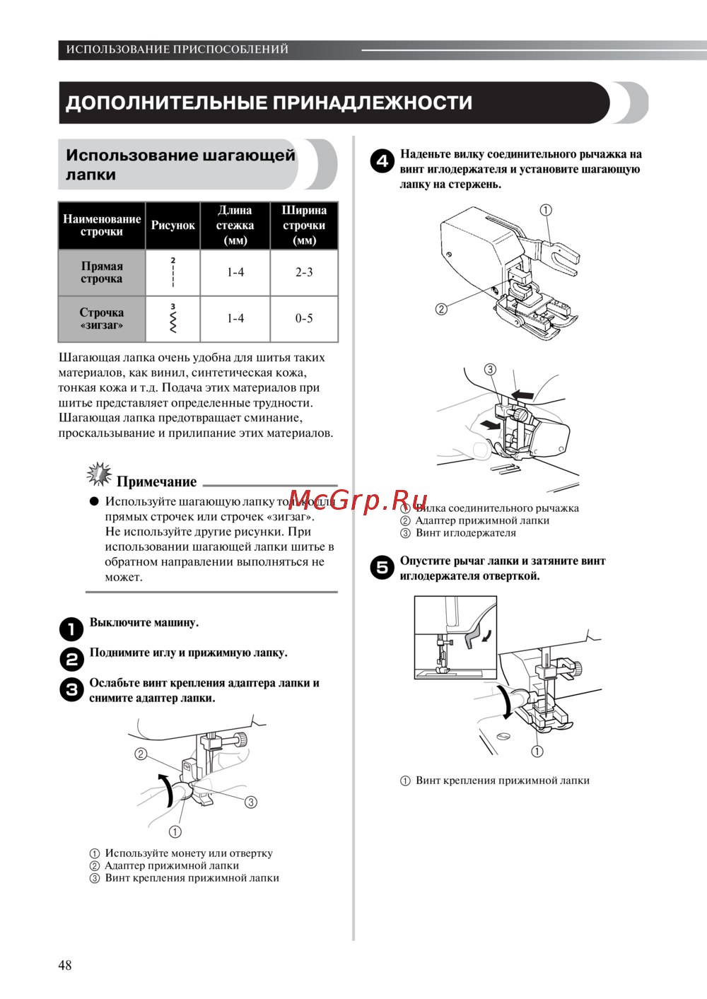 - Используйте только ту прижимную лапку которая предназначена для выполняемой в текущей момент операции если использовать не ту лапку игла может ударить по прижимной лапке и погнуться или сломаться что может привести к травме p.32