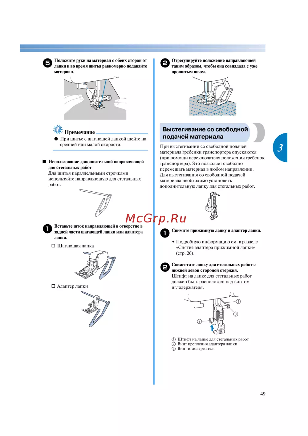 Узнайте, как правильно использовать шагающую лапку и стегальную направляющую для шитья. Подробные инструкции по настройке и выстегиванию со свободной подачей материала.