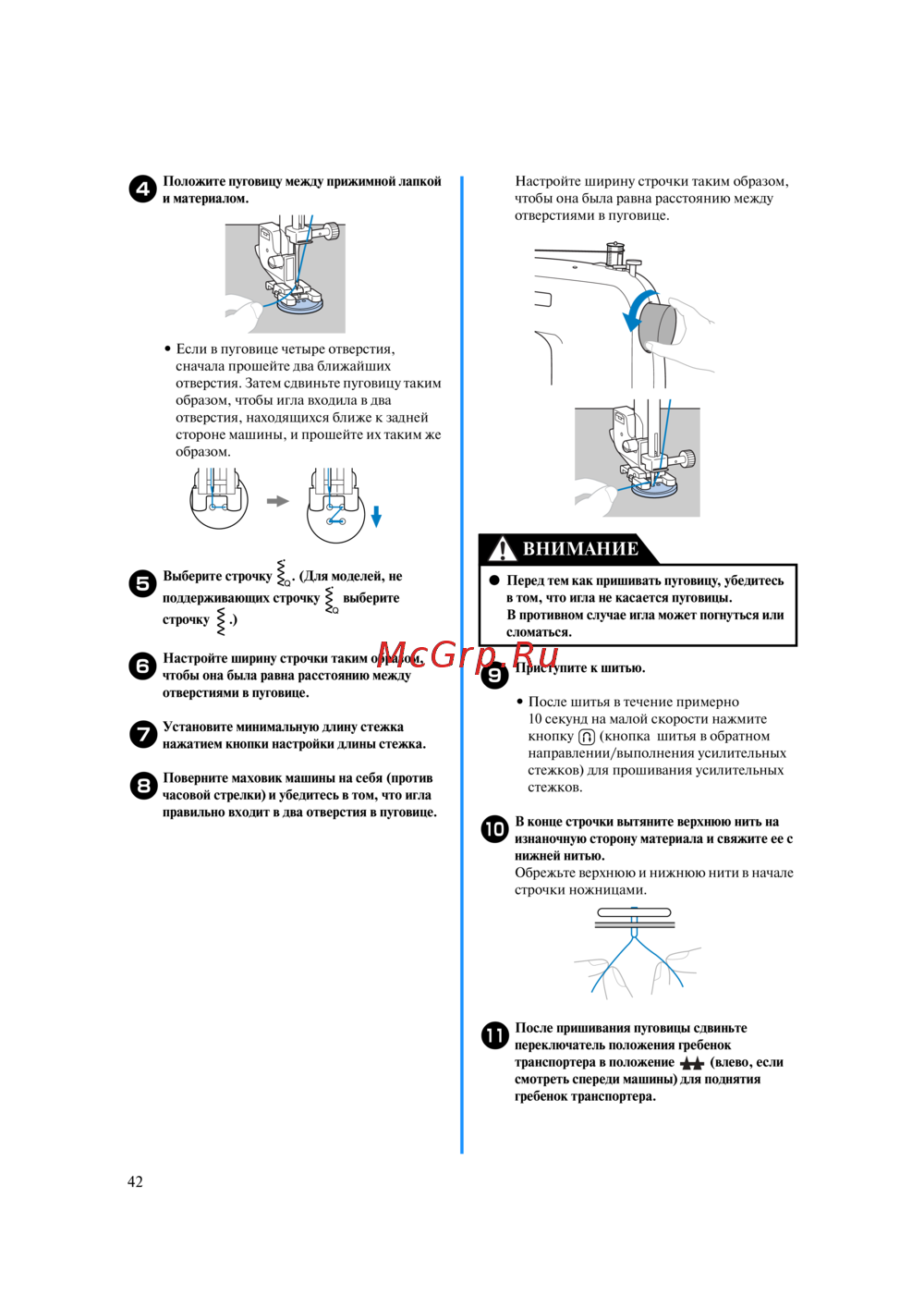 - Если пуговица не помещается в направляющую пластину сложите диаметр и толщину пуговицы затем установите направляющую пластину прижимной лапки в соответствии с полученным значением расстояние между делениями на шкале лапки составляет 5 мм p.42