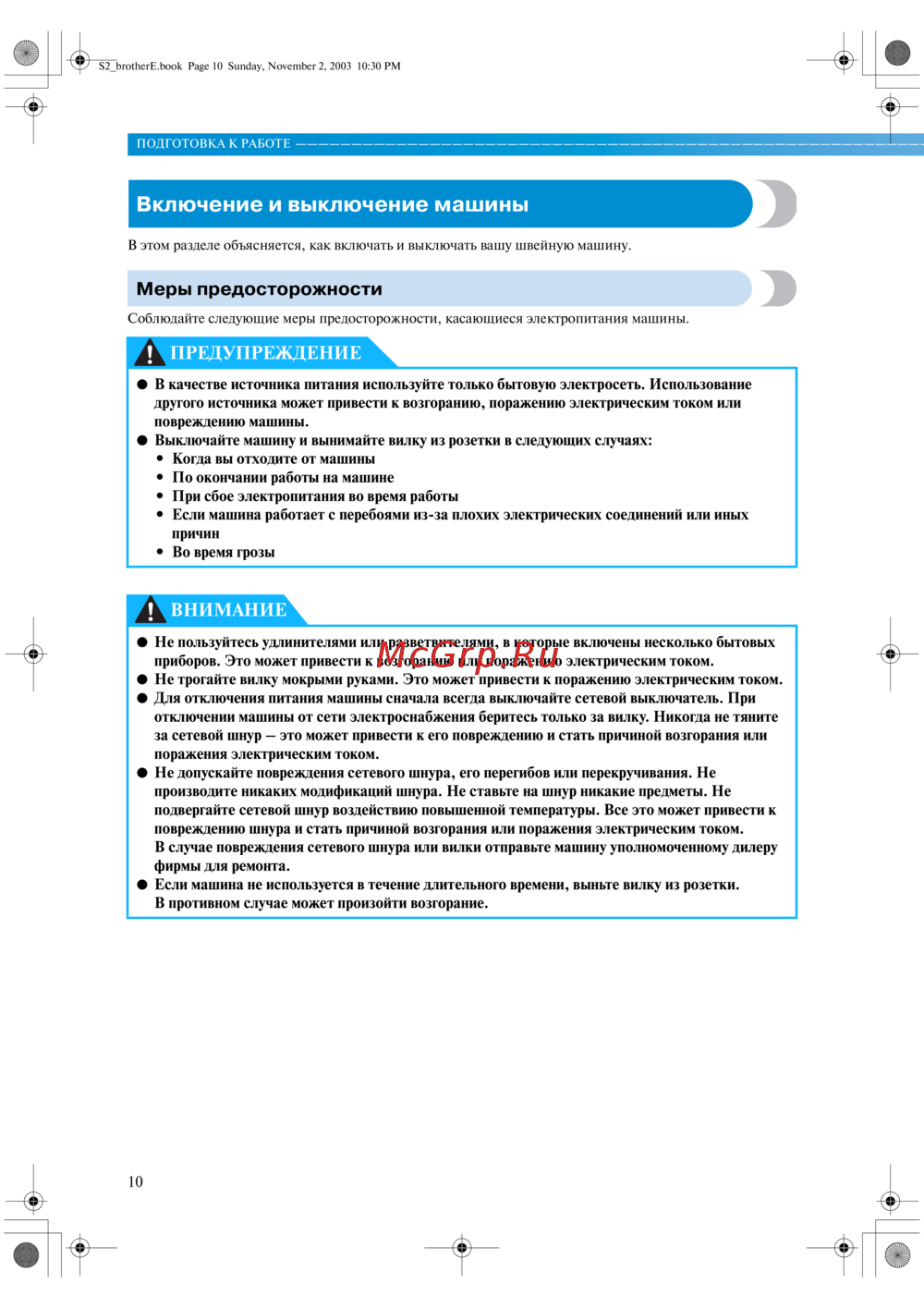 - Перед очисткой машины выньте вилку сетевого шнура из розетки в противном случае возможна травма или поражение электрическим током p.106