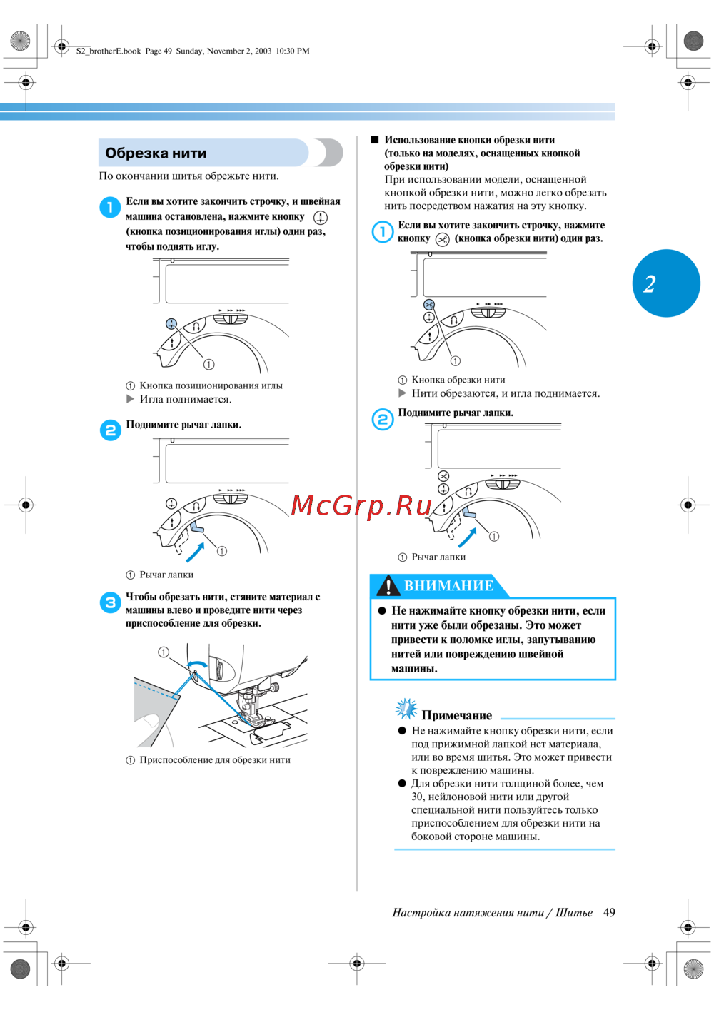 - Не нажимайте кнопку обрезки нити если под прижимной лапкой нет ткани или во время шитья это может привести к повреждению машины для обрезки нитей более толстых чем 30 или других специальных нитей пользуйтесь приспособлением для обрезки расположенным на боковой стороне машины подробную информацию см в разделе обрезка нити на стр 49 p.5