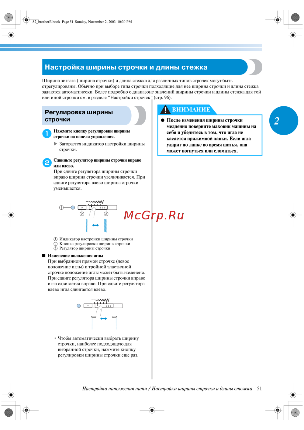 - Установите ширину строчки не более 6 0 мм в противном случае игла может погнуться или сломаться p.98