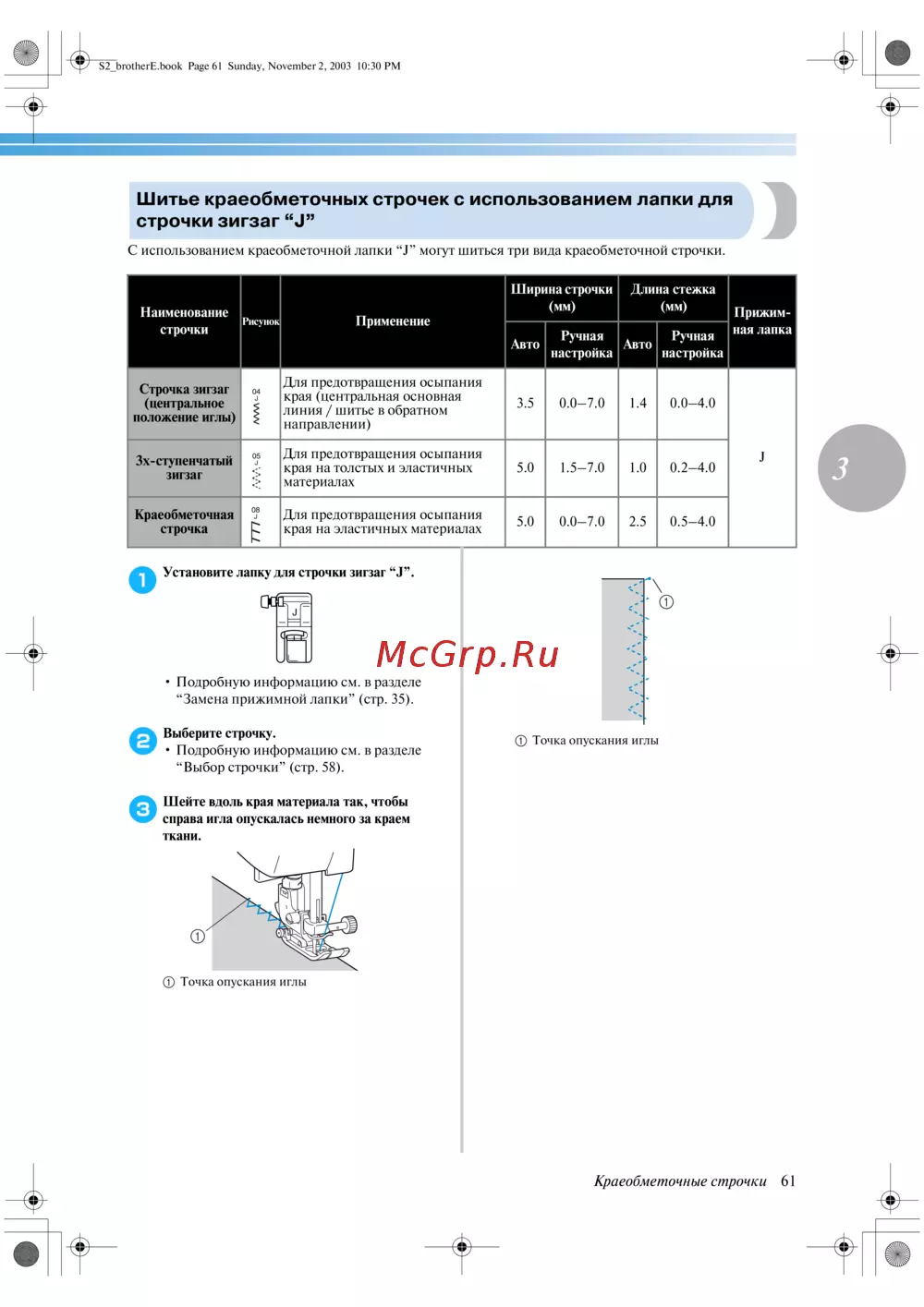 С использованием краеобметочной лапки “J” могут шиться три вида краеобметочной строчки.