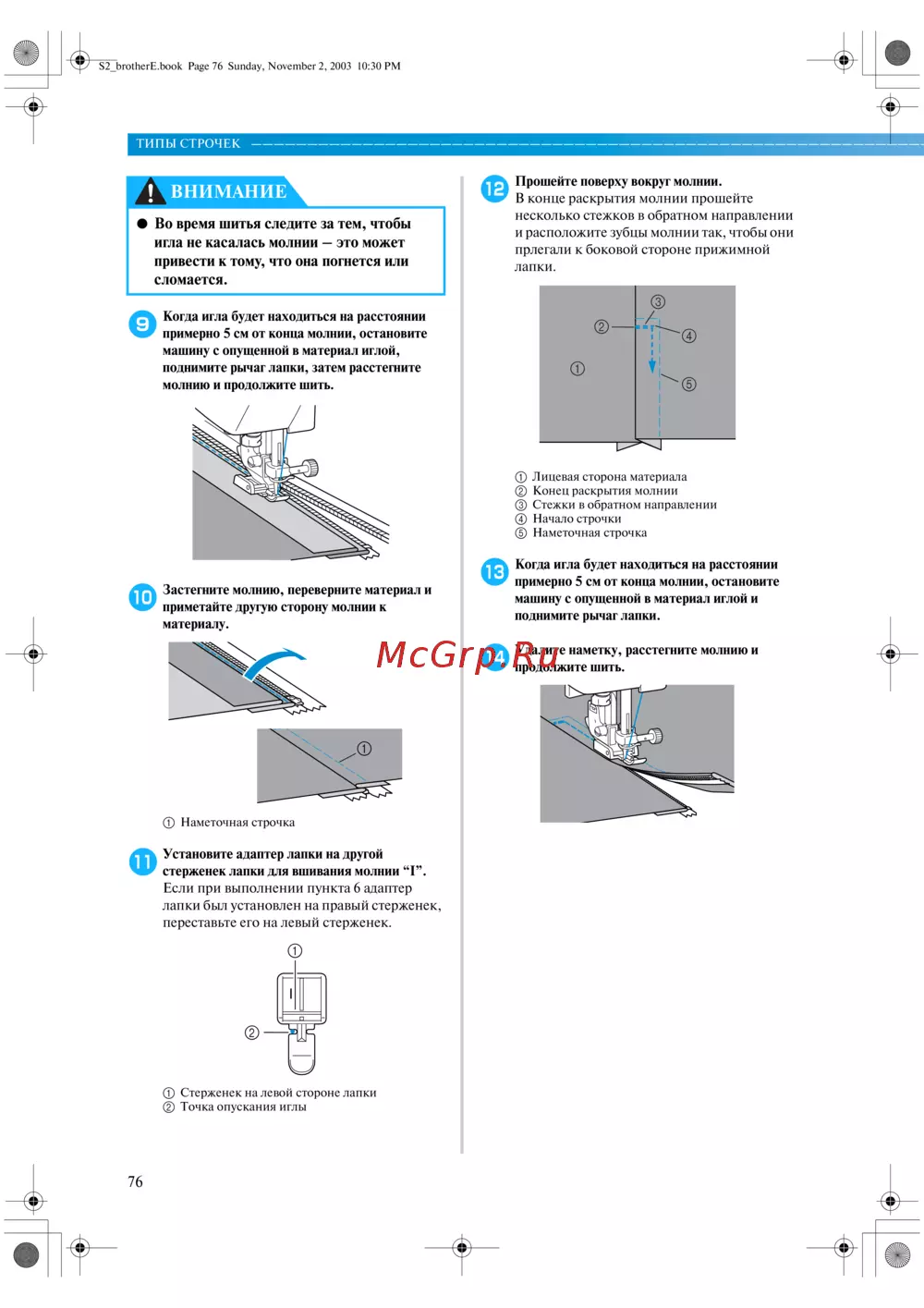 - Во время шитья следите за тем чтобы иглане касалась молнии это может привести к тому что она погнется или сломается p.80
