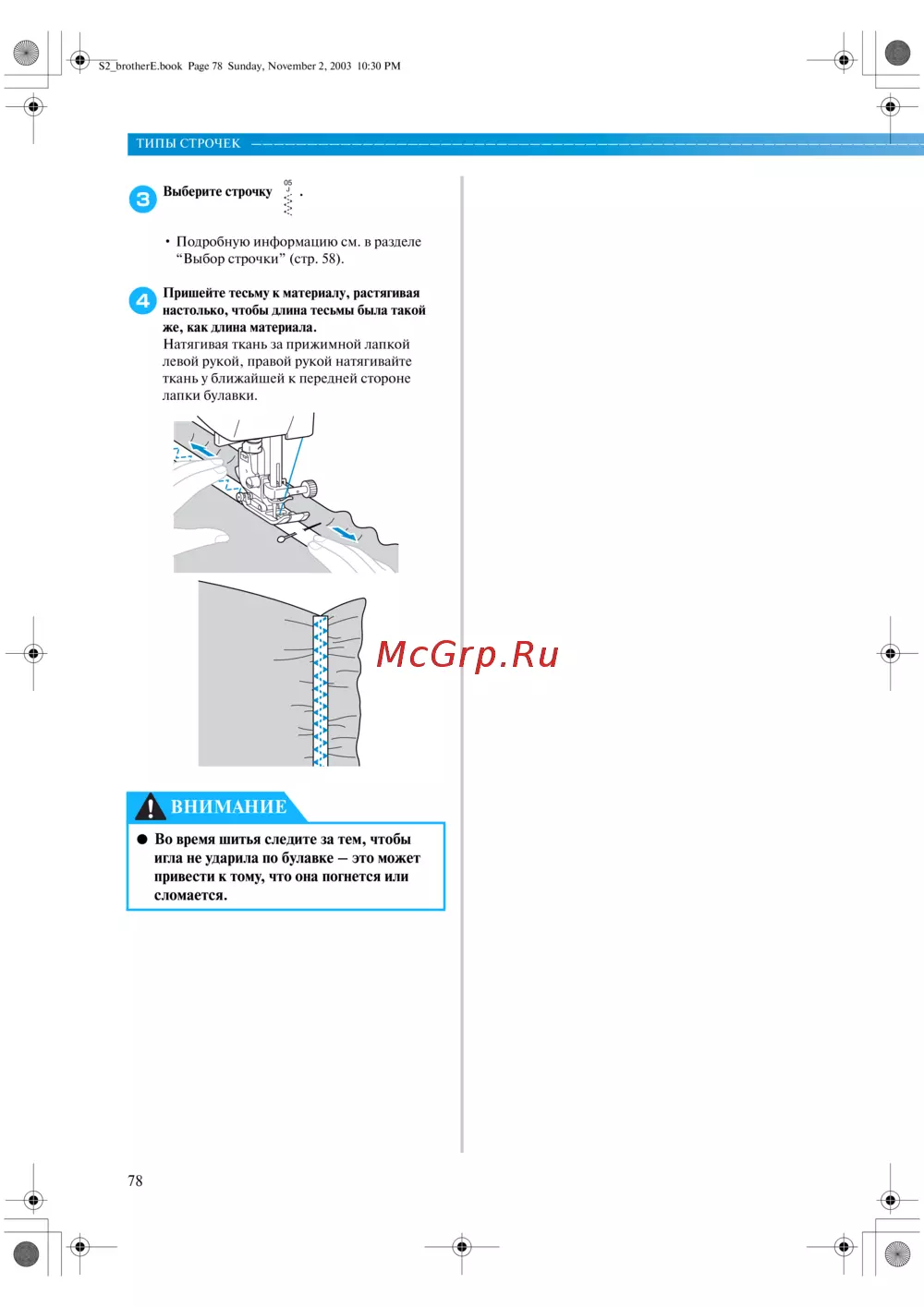 - Установите ширину строчки не более 6 0 мм в противном случае игла может погнуться или сломаться p.98
