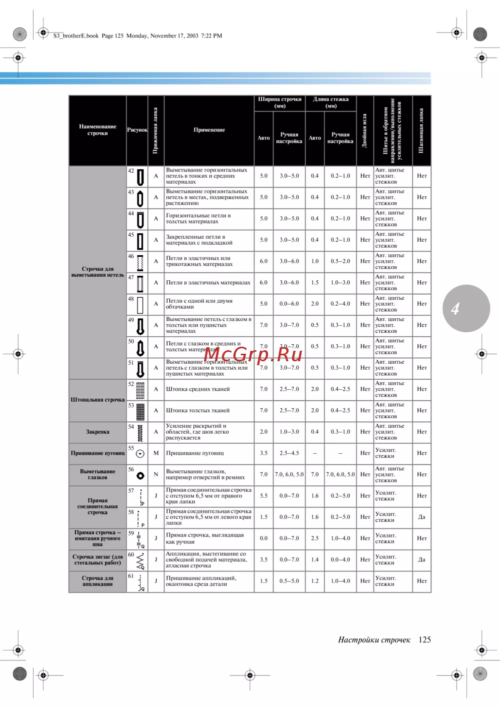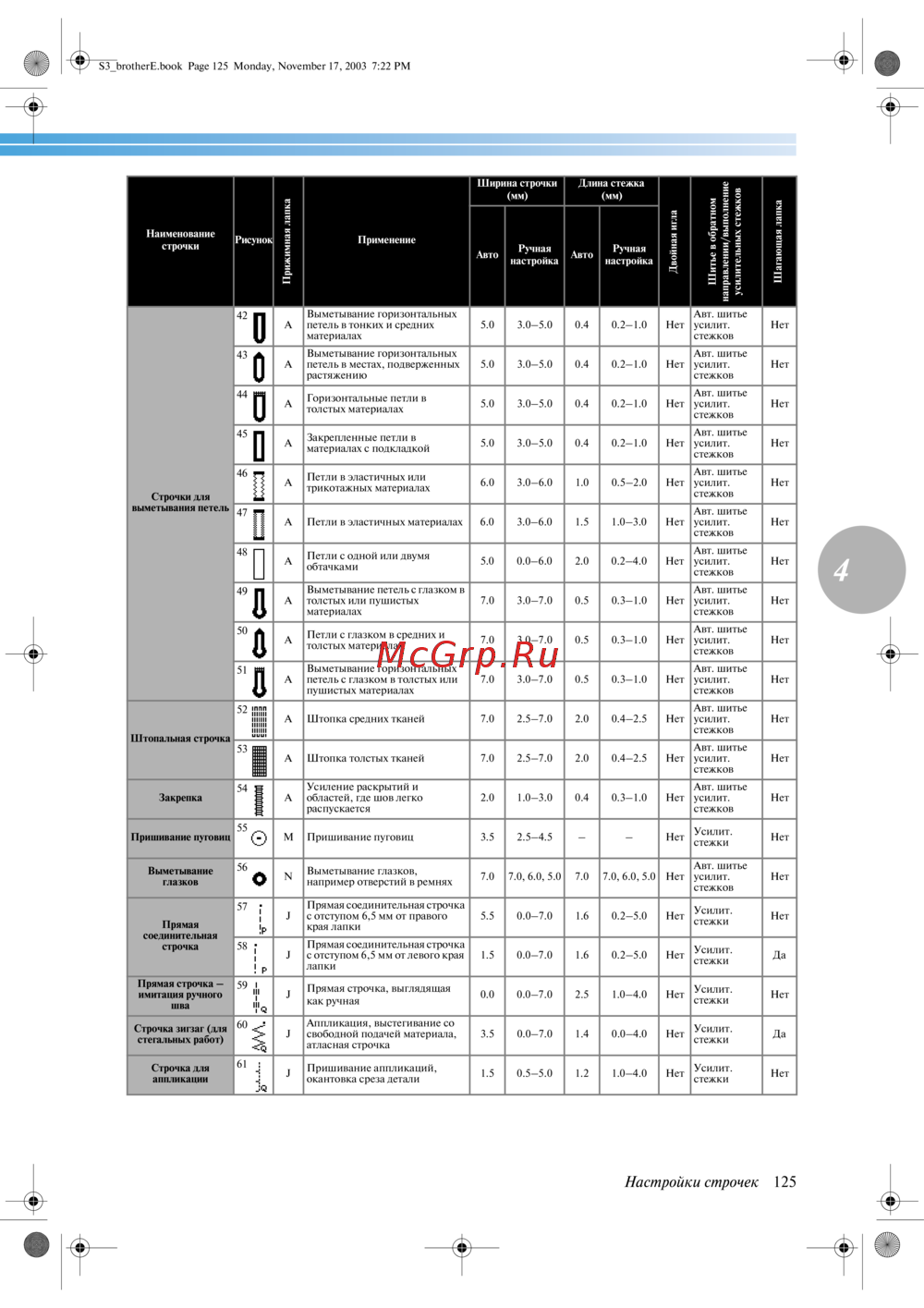 - В приведенной ниже таблице указаны применения длина стежка и ширина строчки для различных типов строчек кроме того в таблице указано может ли та или иная строчка шиться двойной иглой p.128