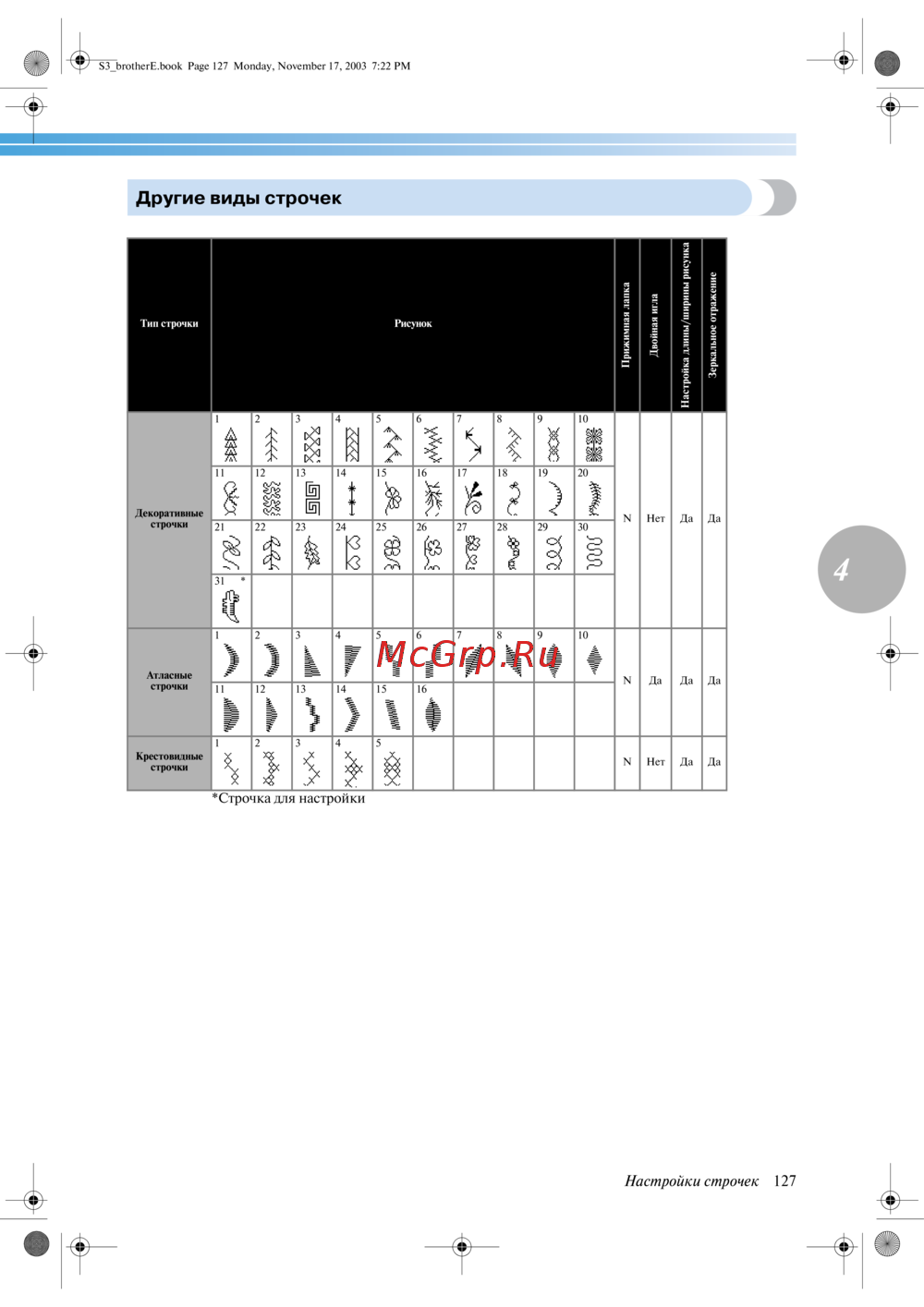 - В приведенной ниже таблице указаны применения длина стежка и ширина строчки для различных типов строчек кроме того в таблице указано может ли та или иная строчка шиться двойной иглой p.128
