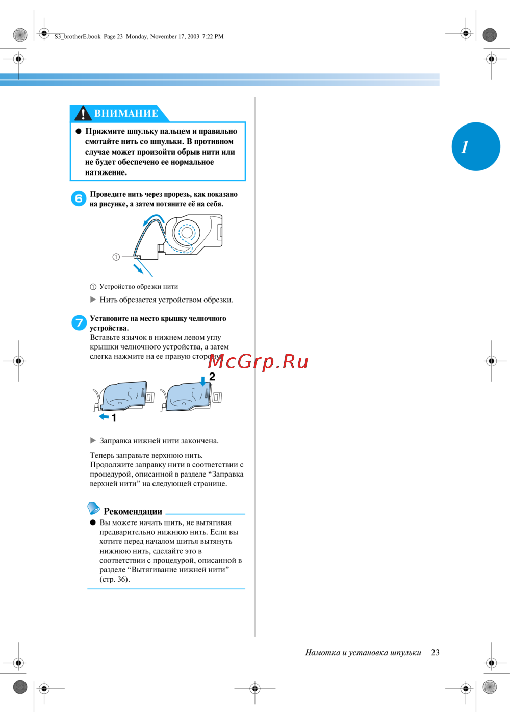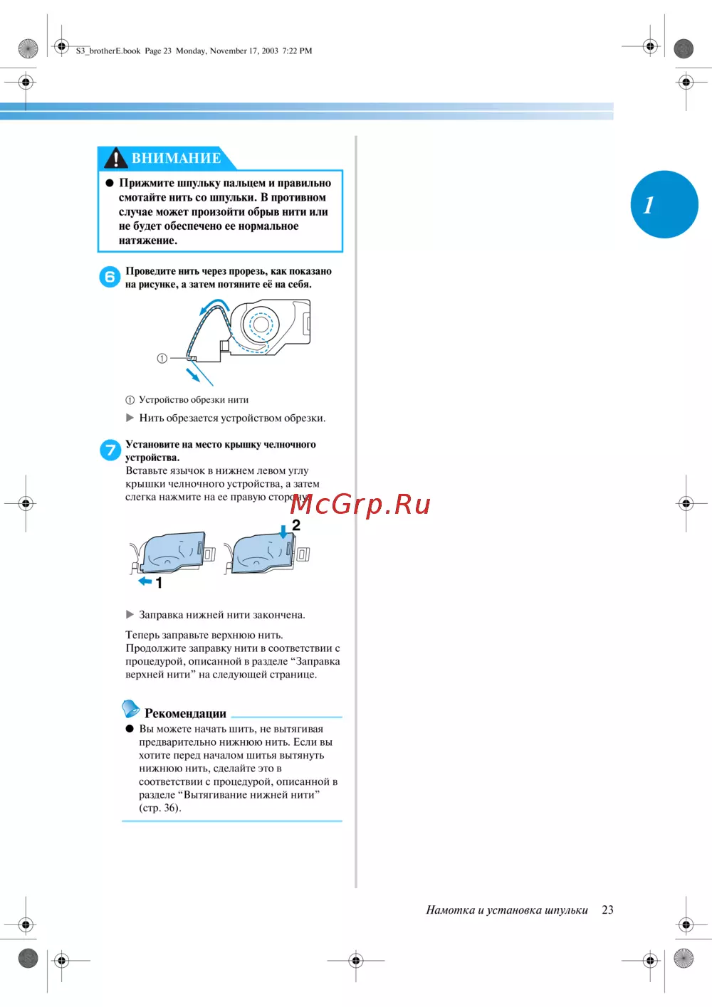 Brother CS-8120 — как правильно намотать и установить шпульку для шитья [29/144]