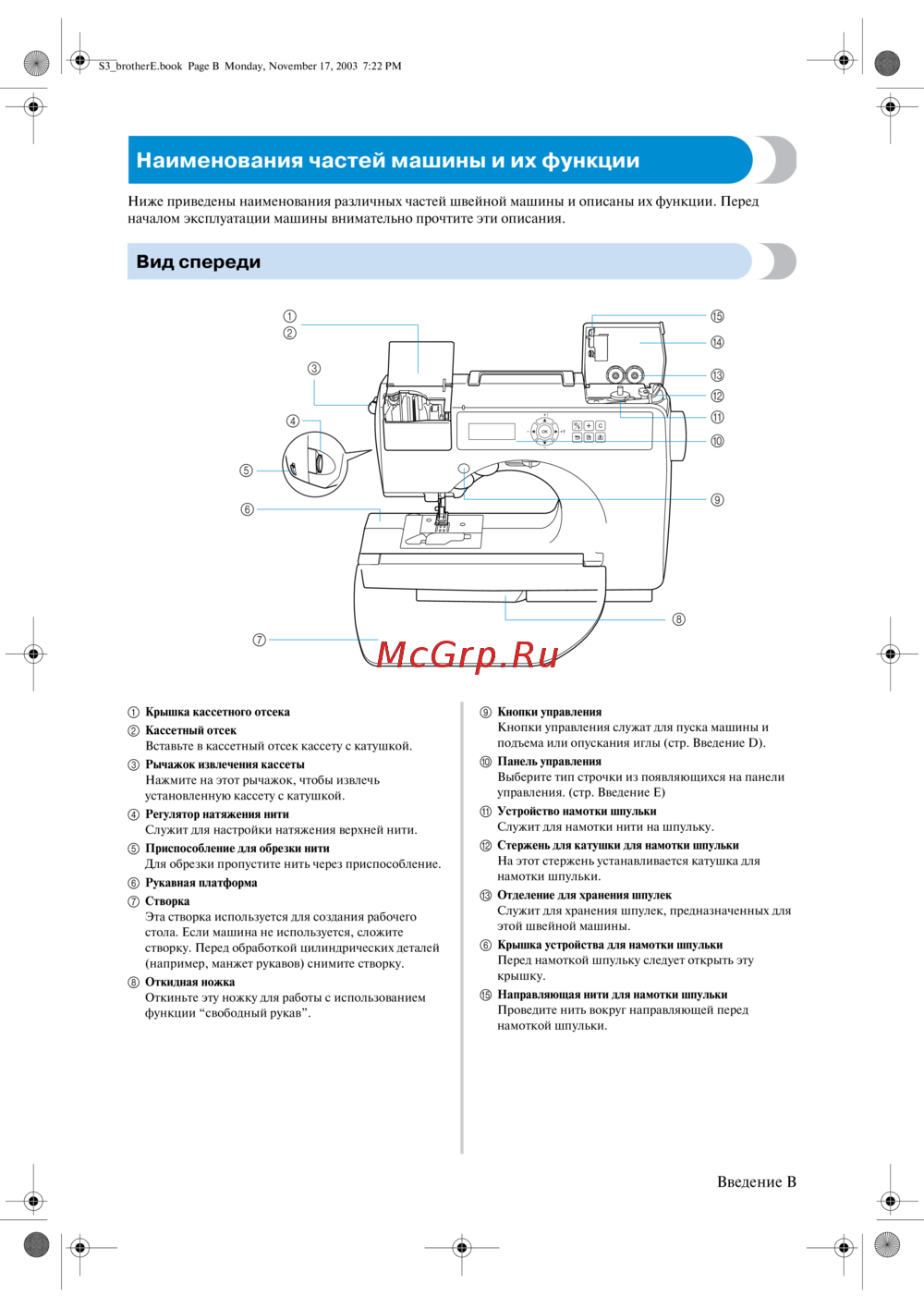 - Благодарим вас за покупку этой швейной машины перед началом эксплуатации машины внимательно прочтите раздел инструкции по безопасности стр 6 а затем изучите настоящее руководство чтобы правильно использовать различные функции машины и выполнять различные операции храните руководство в легкодоступном месте чтобы при необходимости получить всю необходимую информацию p.8