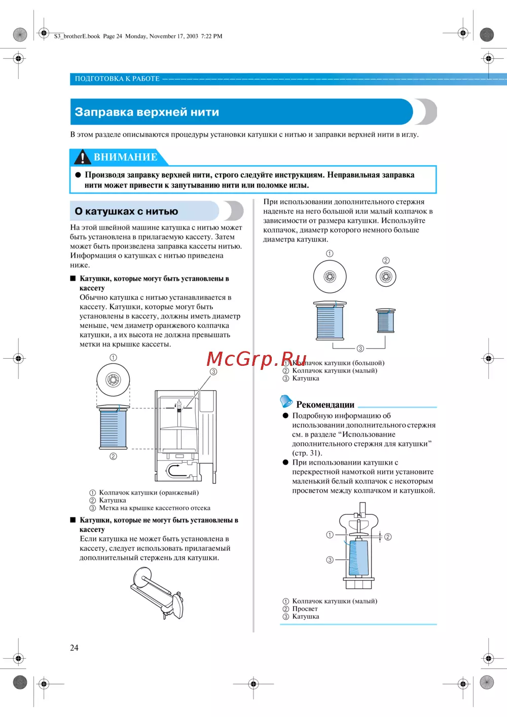 ● Производя заправку верхней нити, строго следуйте инструкциям. Неправильная заправка