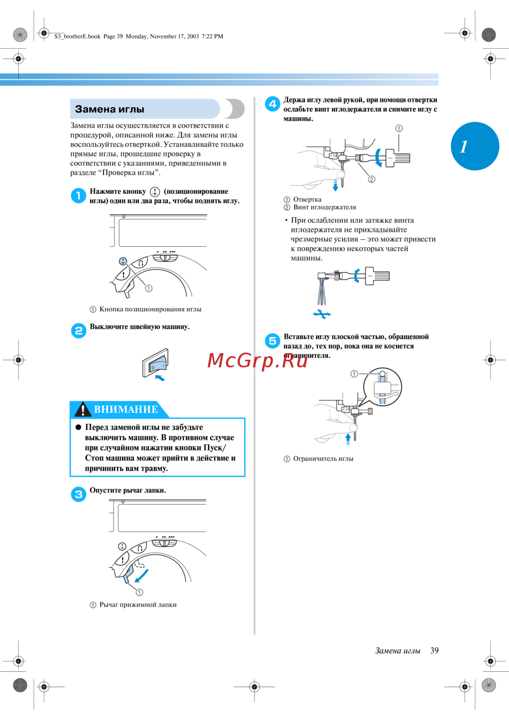 - Надежно затяните винт крепления отверткой в противном случае игла может ударить по прижимной лапке и погнуться или сломаться p.103