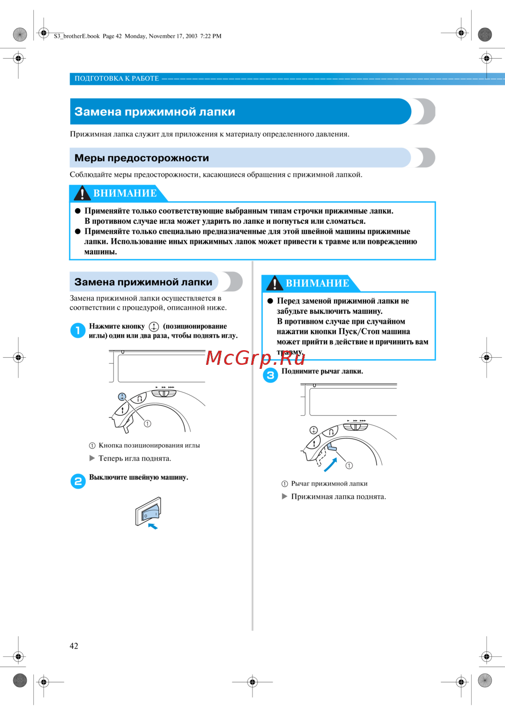 лапки. Использование иных прижимных лапок может привести к травме или повреждению